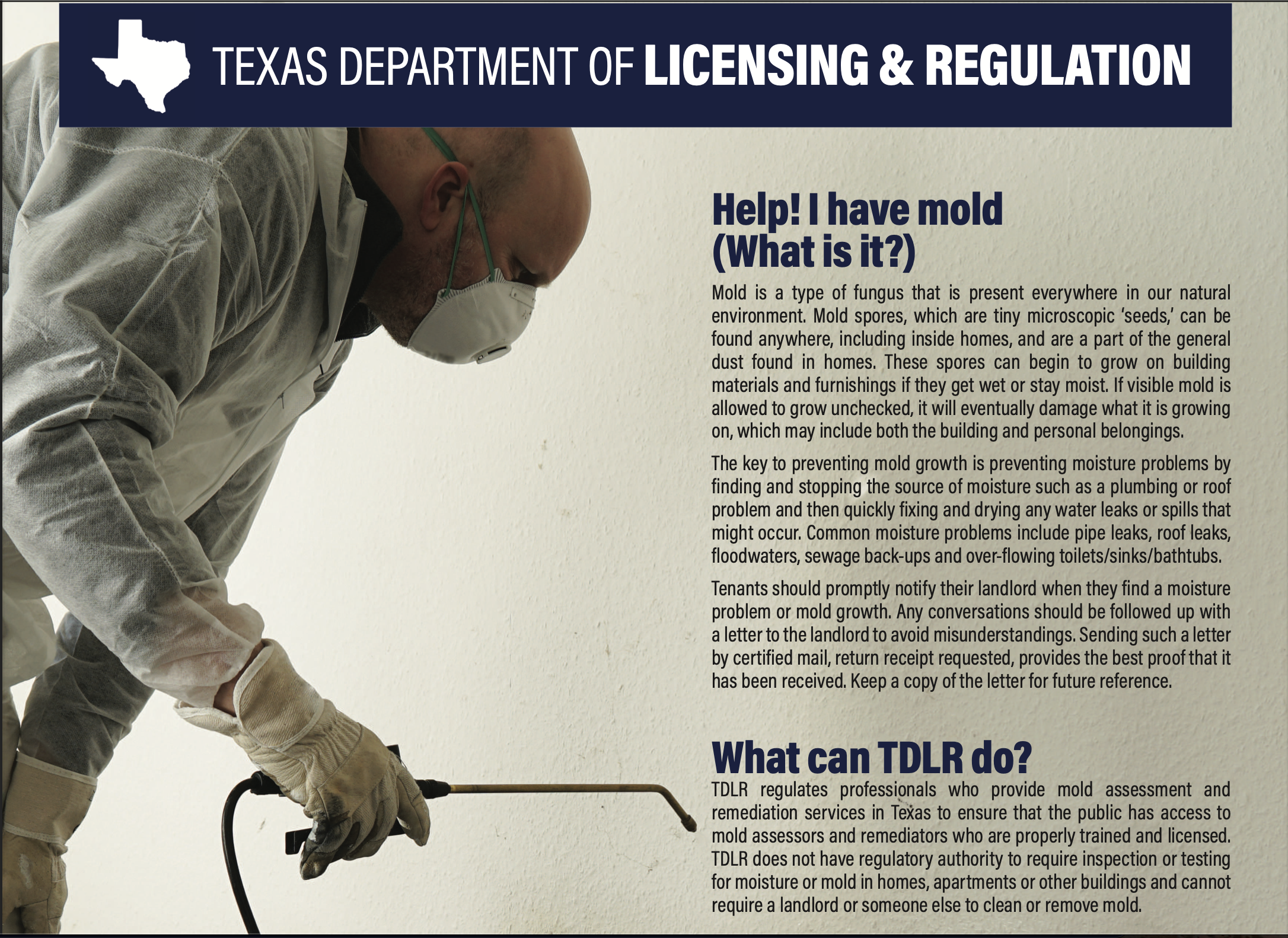 In Texas, do landlords have to fix mold issues? Landlords are obligated to fix anything that "materially affects the physical health or safety of an ordinary tenant." There is mold in every home, and not all mold issues will meet the threshold of materially affecting health, but some mold issues might. See the following information from the Texas Department of Licensing and Regulation (TDLR), and make sure you know your rights as a tenant, understand your lease, and have properly inspected a rental unit BEFORE entering into any agreement. If you are a landlord wanting to know about your specific situation, please reach out.